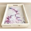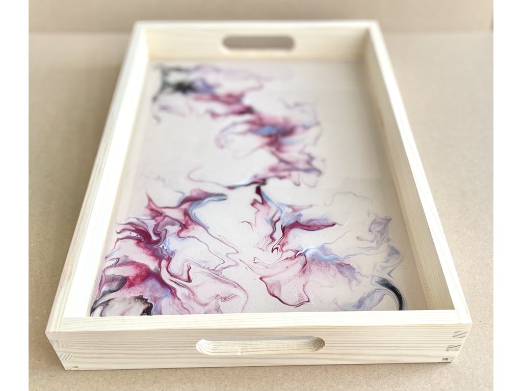 Ručně malovaný dřevěný podnos či servírovací tác se světle béžovým podkladem a vínovo-modrým motivem. Barva je pokryta vrstvou dokonale čiré a lesklé křišťálové pryskyřice.