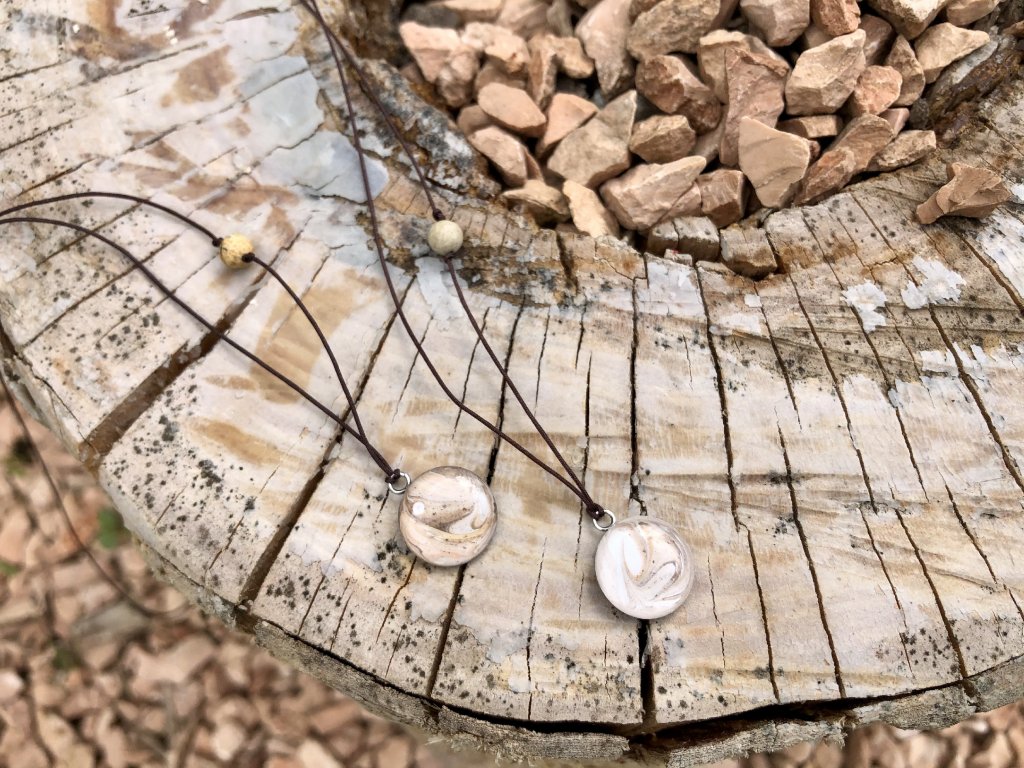 Jemný kulatý, ručně malovaný náhrdelník na lůžku zchirurgické oceli, průměr 13 mm. Béžovo-bílá akrylová malba s trochou zlaté je zalita křišťálovou pryskyřicí. Náhrdelník je zavěšen na tmavě hnědé pevné šňůrce, kterou zdobí "piha krásy" v podobě béžového korálku (obrázkový Jaspis 4mm). Stahování dvěma uzlíky, na jejichž koncích najdete drobné Miyuki korálky.