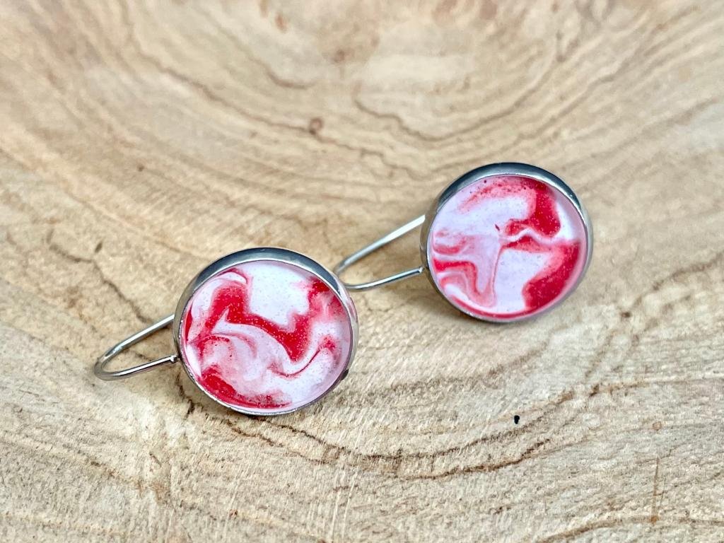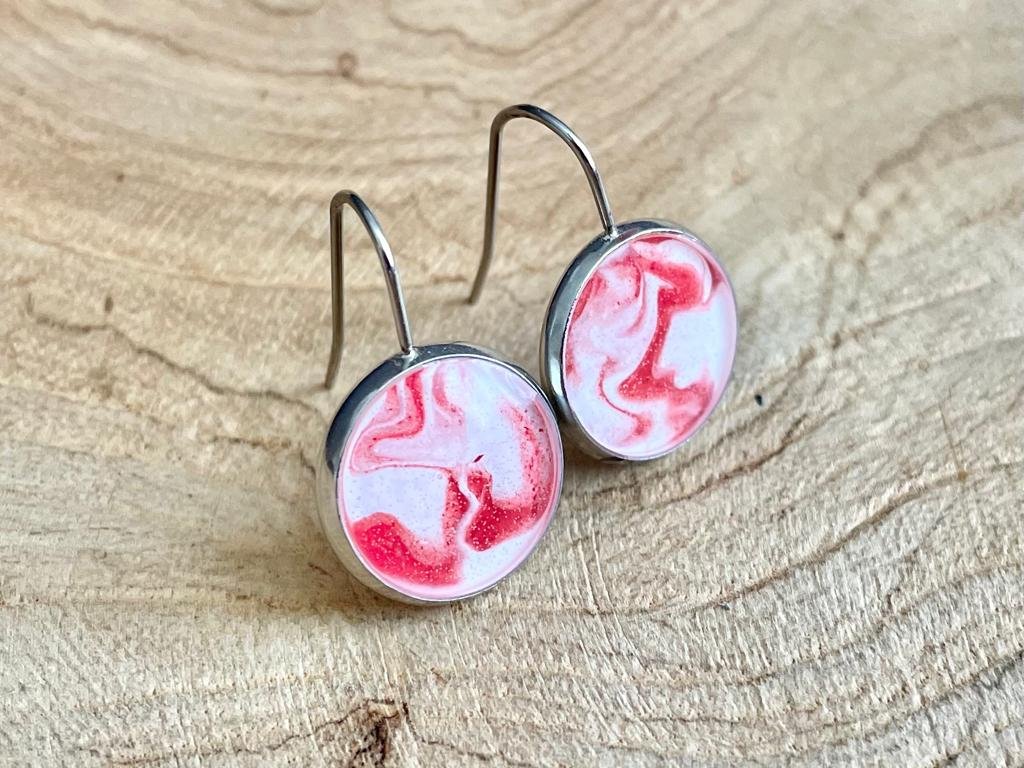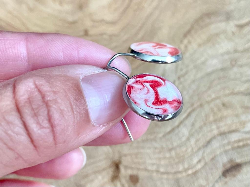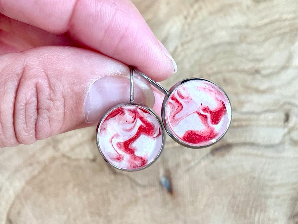 Stylové červeno-bílé náušnice ručně malované červenými a bílými akrylovými barvami. Malba je v nerezovém lůžku o průměru 15 mm zalita křišťálovou pryskyřicí. Náušnice mají drobný nerez háček, na který dodávám silikonové zarážky (lze však nosit i bez nich).