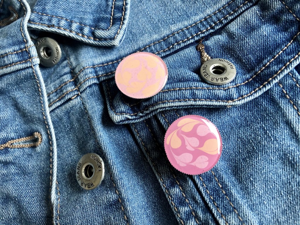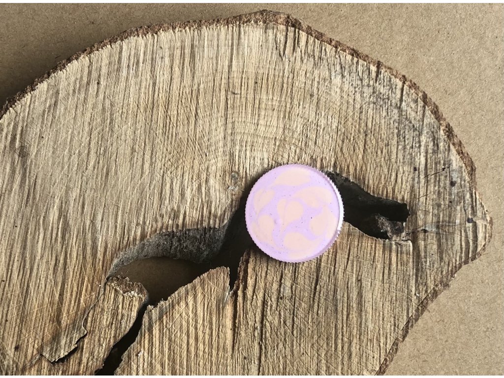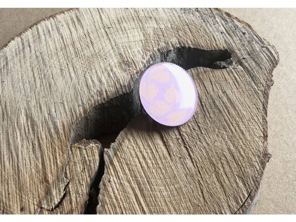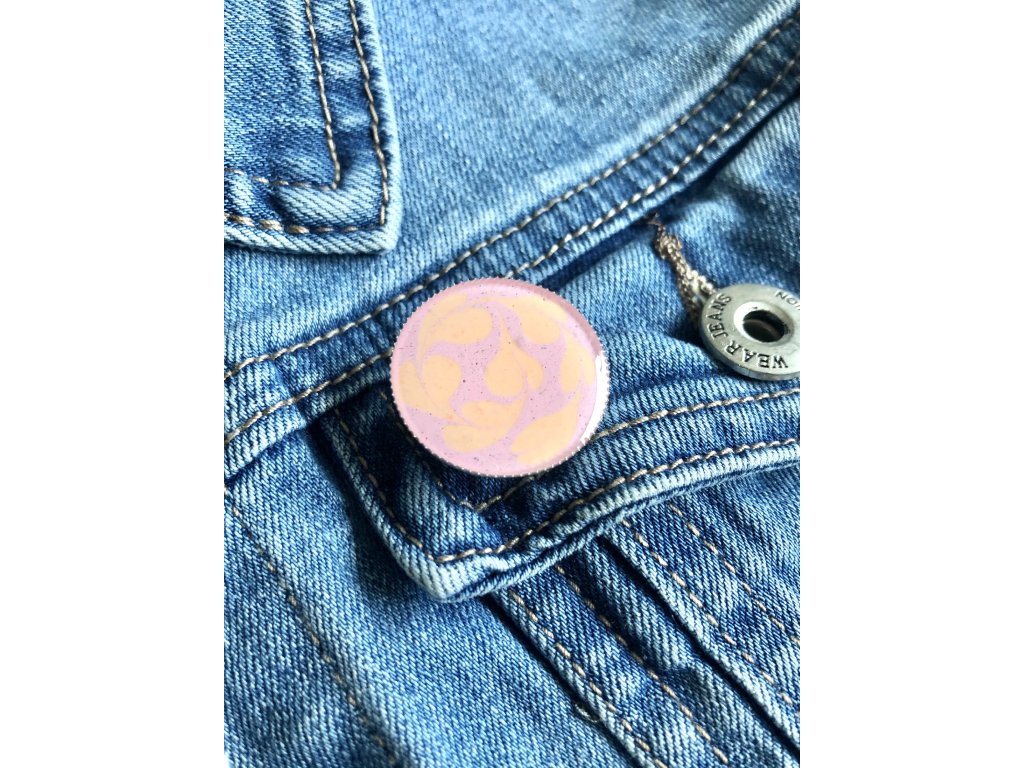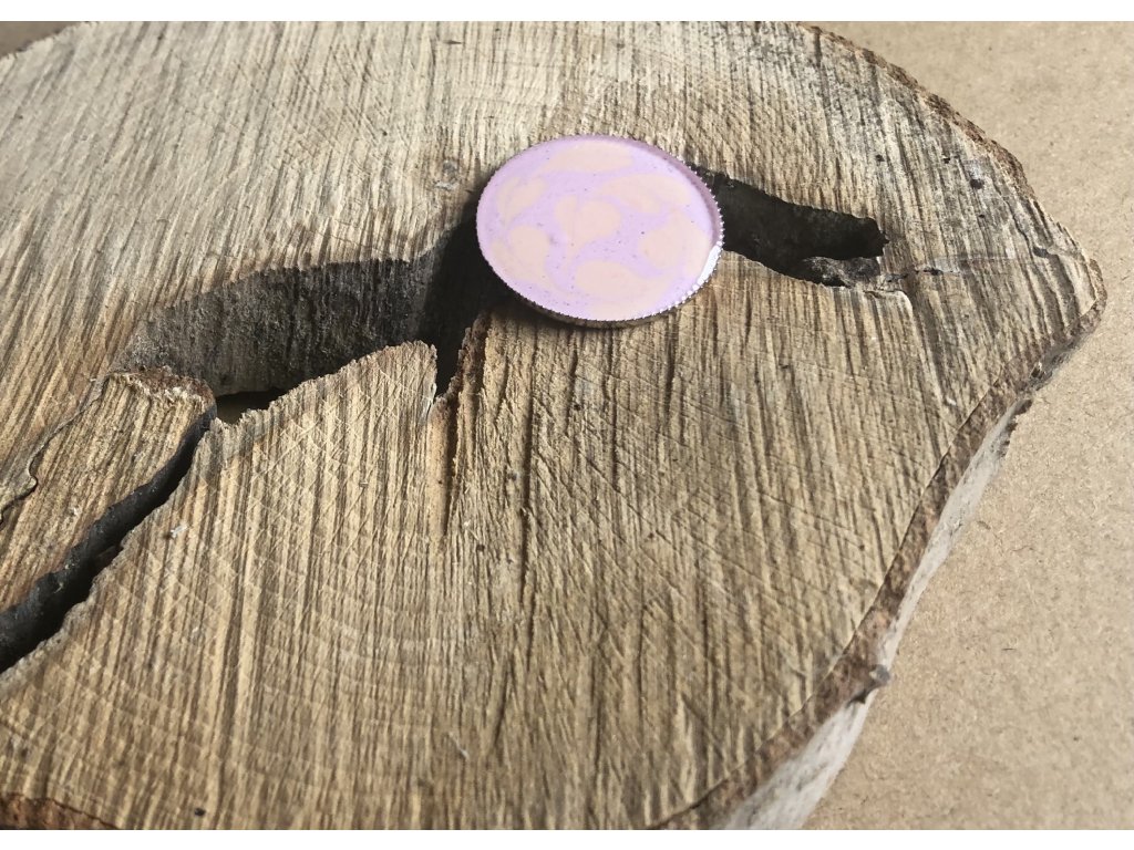 Ručně malovavá brož v hodně jemném provedení světle růžové až fialkové barvy doplněné lístečky v tělové barvě. Brož má kulaté lůžko o průměru 27mm v barvě stříbra s vroubky po obvodu. Zapínání se zajištěním.