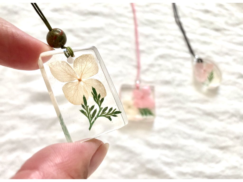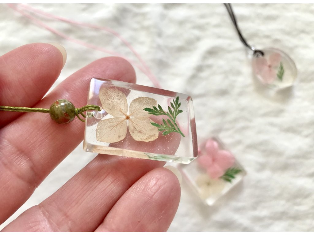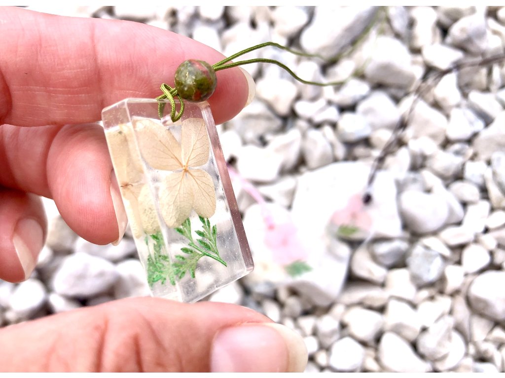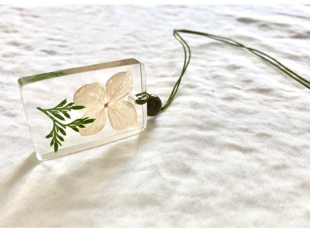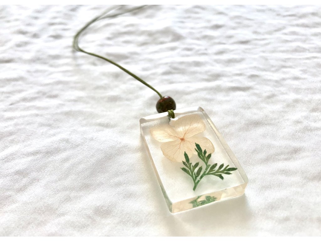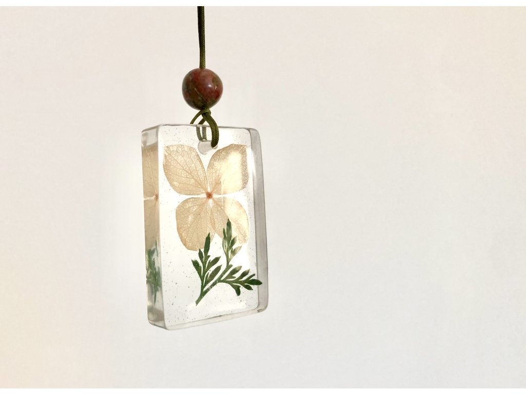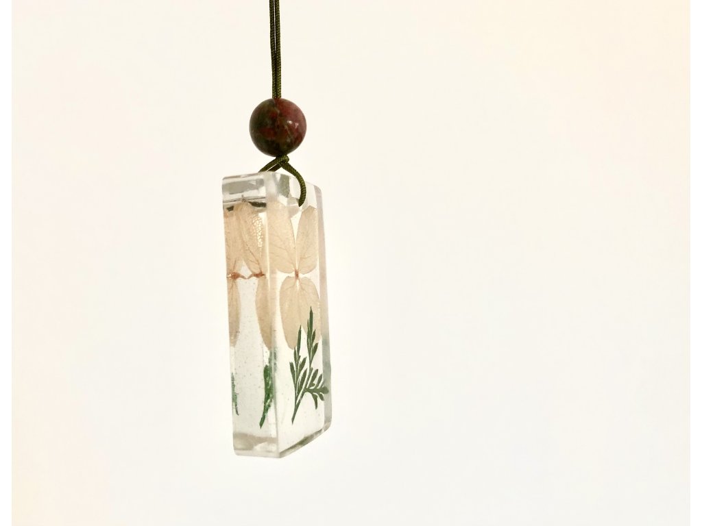 Smetanový žilkovaný čtyřlístek se zeleným lístkem zalitý v křišťálové pryskyřici do náhrdelníku tvaru obdélníku. Šperk je zavěšený na tenké, pevné, zelené šňůrce a ozdobený zeleným růžově mramorovaným korálkem (Unakit 7 mm). Celý náhrdelník je křišťálově průhledný. Délku šňůrky můžete nastavit pomocí stahovacích uzlíků.